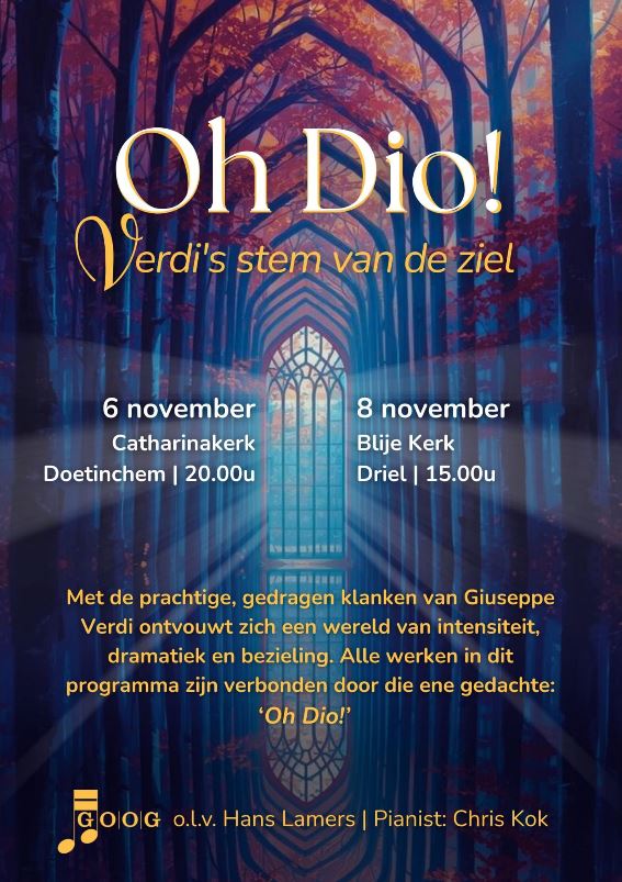 Het Gelders Opera en Operette Gezelschap (GOOG) presenteert de concertenreeks “Oh Dio!“. In dit bijzondere koorproject staan de werken van Giuseppe Verdi centraal. Met een groot koor gaan we indrukwekkende, religieus geïnspireerde koorwerken van Giuseppe Verdi groots laten klinken in twee prachtige sfeervolle kerken in Gelderland.